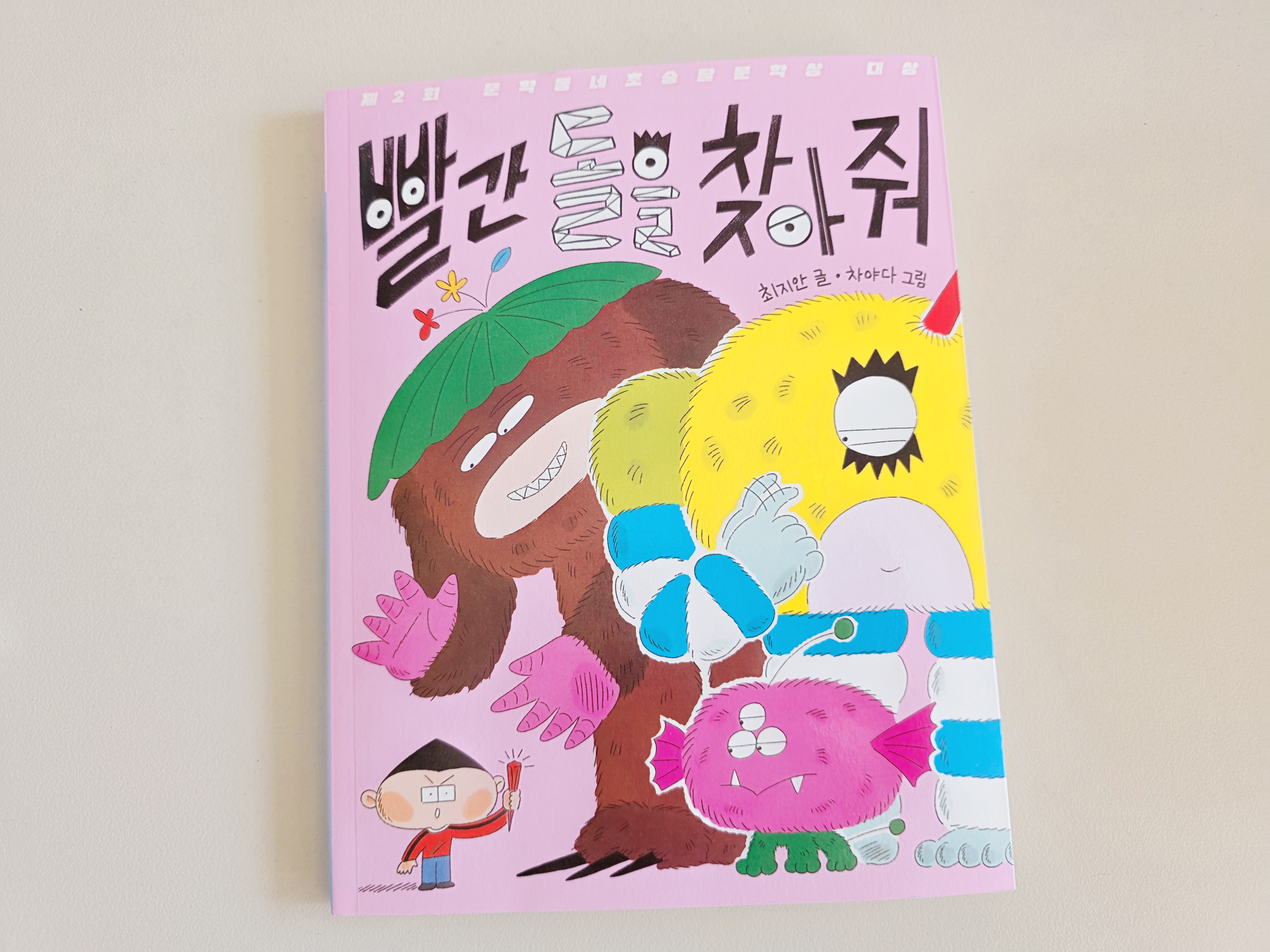 분홍색 표지에 재미있게 생긴 괴물 세마리와 왼쪽 아래에 서 있는 친구가 우리의 주인공 "석구"입니다.