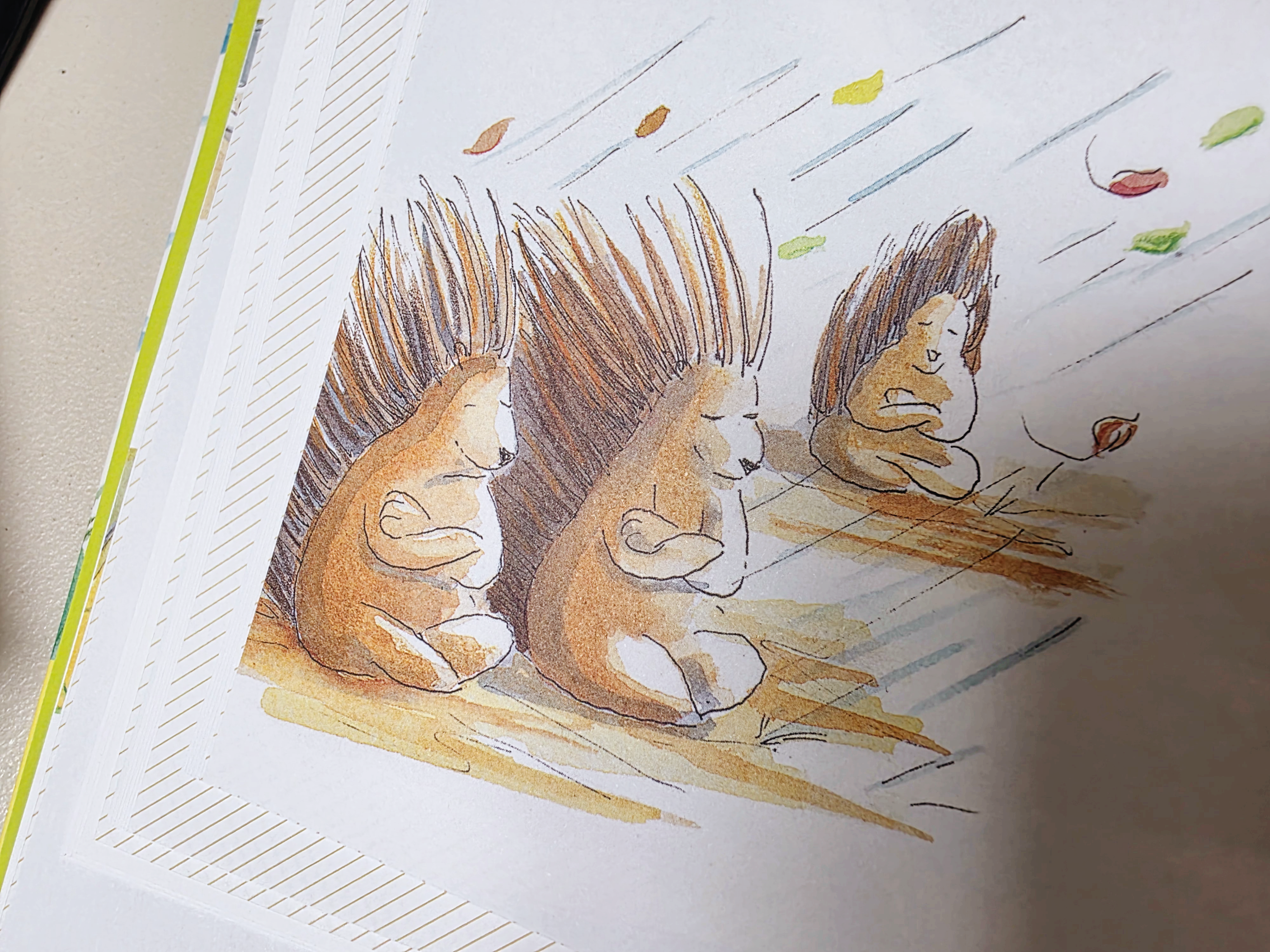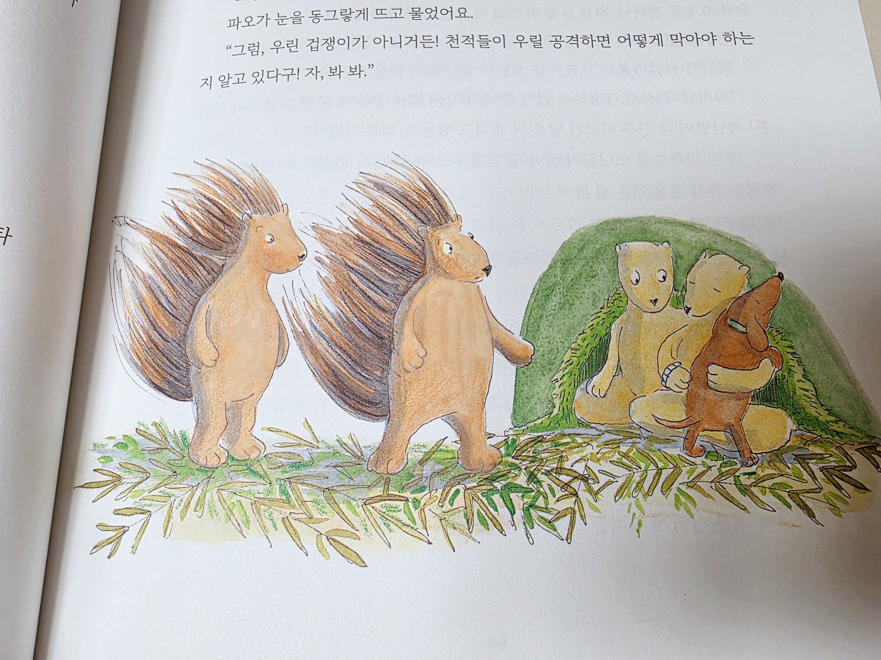 고슴이들은 더운 곳에 살아서 얇은 털만 가지고 있었고, 도치들은 매우 추운 곳에 살아서 빽빽한 가시를 가지고 있었습니다.