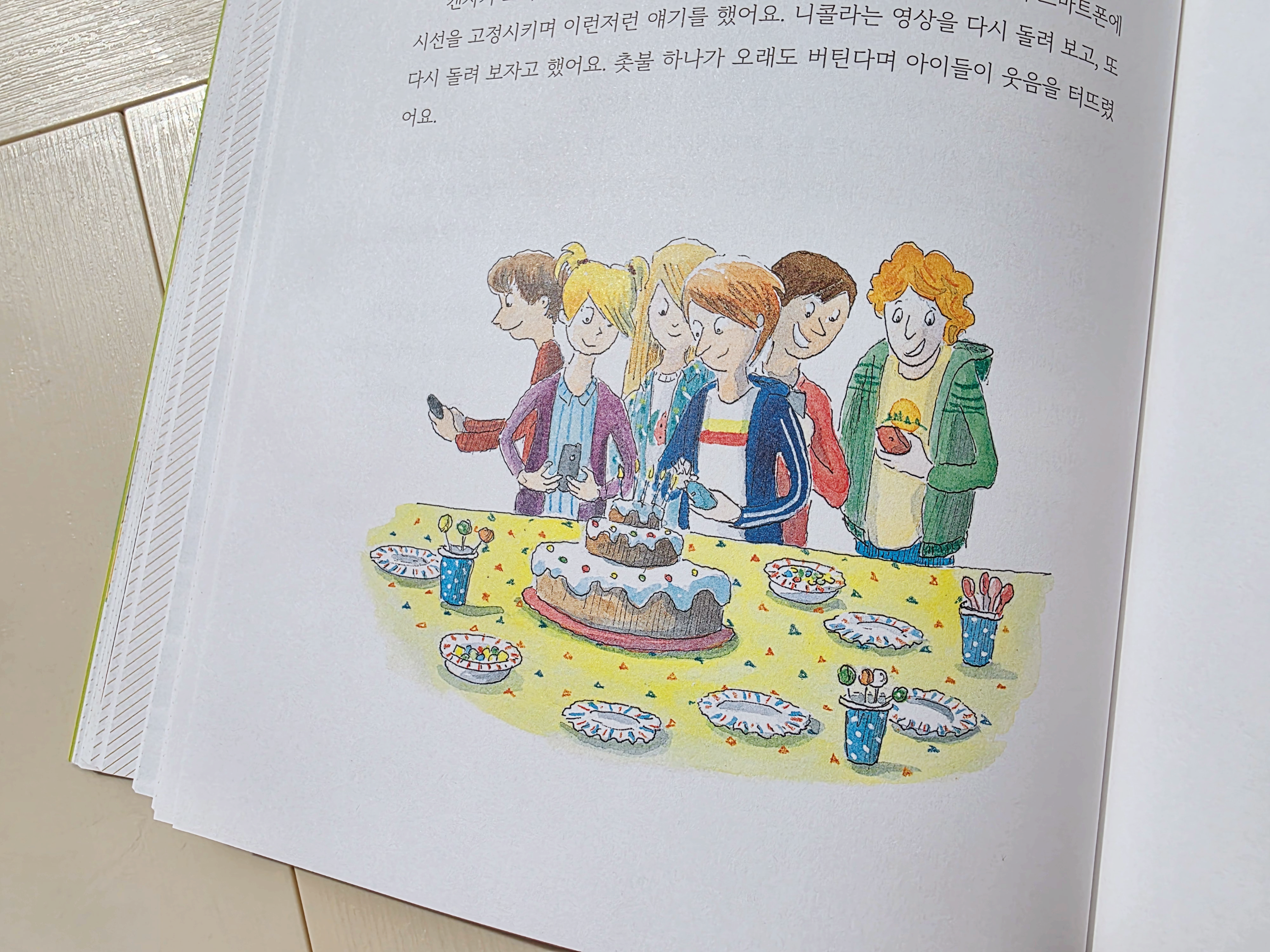 이 이야기에서 주인공은 스마트폰이 없습니다. 친구의 생일파티에 갔을 때, 케이크는 매우 예쁘게 준비되어 있었습니다.