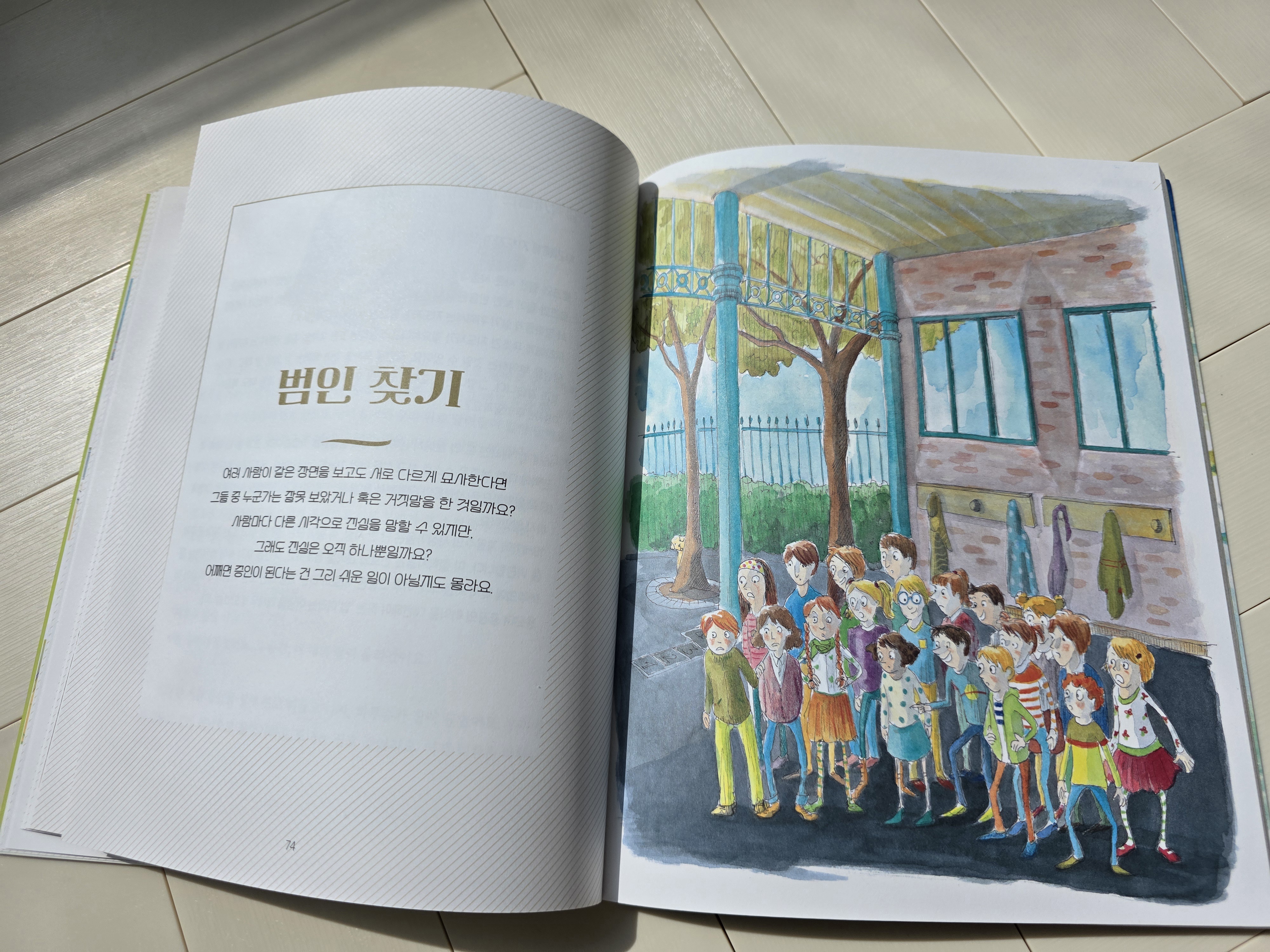 *출판사의 지원으로 도서를 제공받아 6학년 아이가 직접 작성한 서평입니다. '범인 찾기’는 커다란 그림을 중심으로 이야기가 시작됩니다.이 그림은 아이들이 전시회와 학부모 공개 수업 때 보여주기 위해 함께 그린 작품으로,아이들은 매일 1시간씩 시간을 들여 정성껏 그림을 완성해 왔습니다.그런데 공개 당일, 그림이 심하게 훼손되어 있는 것을 발견하게 됩니다.아이들은 모두 범인을 보았다고 말했지만, 각자가 말하는 범인의 모습은 서로 달랐습니다. 옷차림도 다르고, 성별도 다른 등 증언이 모두 달라 혼란스러운 상황이었습니다. 교장 선생님은 그중 단 한 명만이 제대로 보았다고 말씀하셨습니다.주인공 역시 어떤 사람을 보았다고 생각하며 그 사람이 범인이라고 확신했습니다.하지만 다른 아이들도 각자 자신이 본 사람을 이야기..